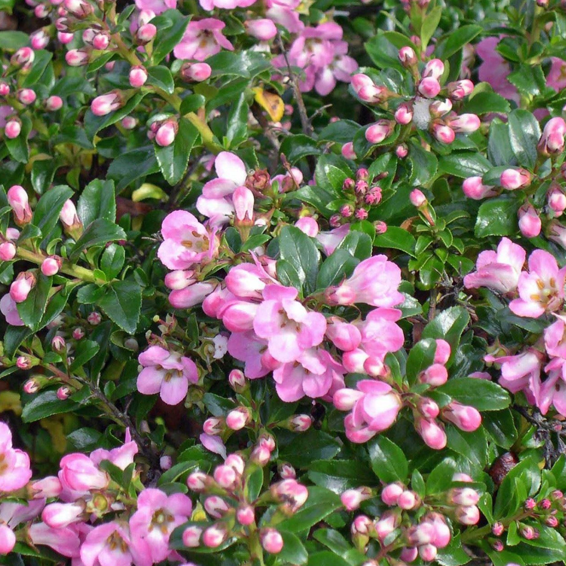 A popular shrub due to its hardiness and ease of care, the Escallonia ‘Apple Blossom’ is a great choice for just about any garden as it will fit nicely into any informal hedging, border or bedding display. This evergreen shrub carries glossy dark green leaves and in the early Summer months you begin to see bright, tubular pale pink flowers that contrast beautifully with the dark foliage.