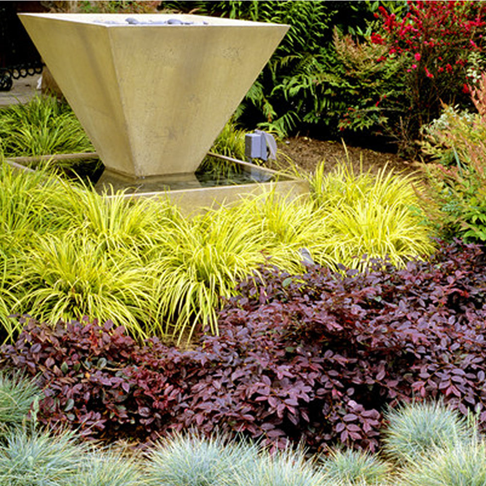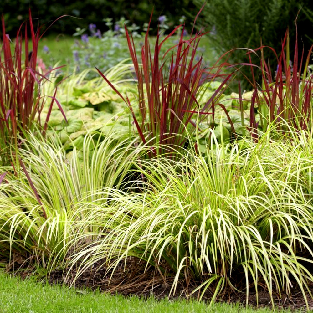 'Ogon' is a compact deciduous grass-like perennial forming a clump to 30cm tall, with narrow, bright yellow leaves, lightly striped with yellowish-green