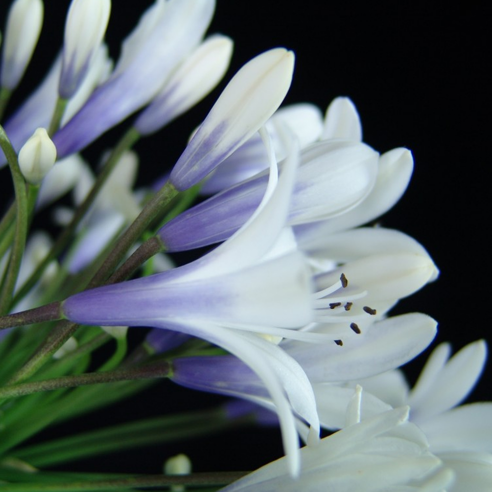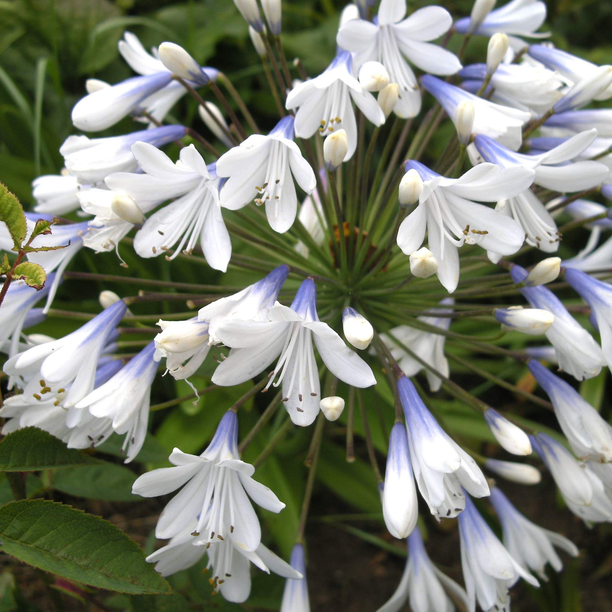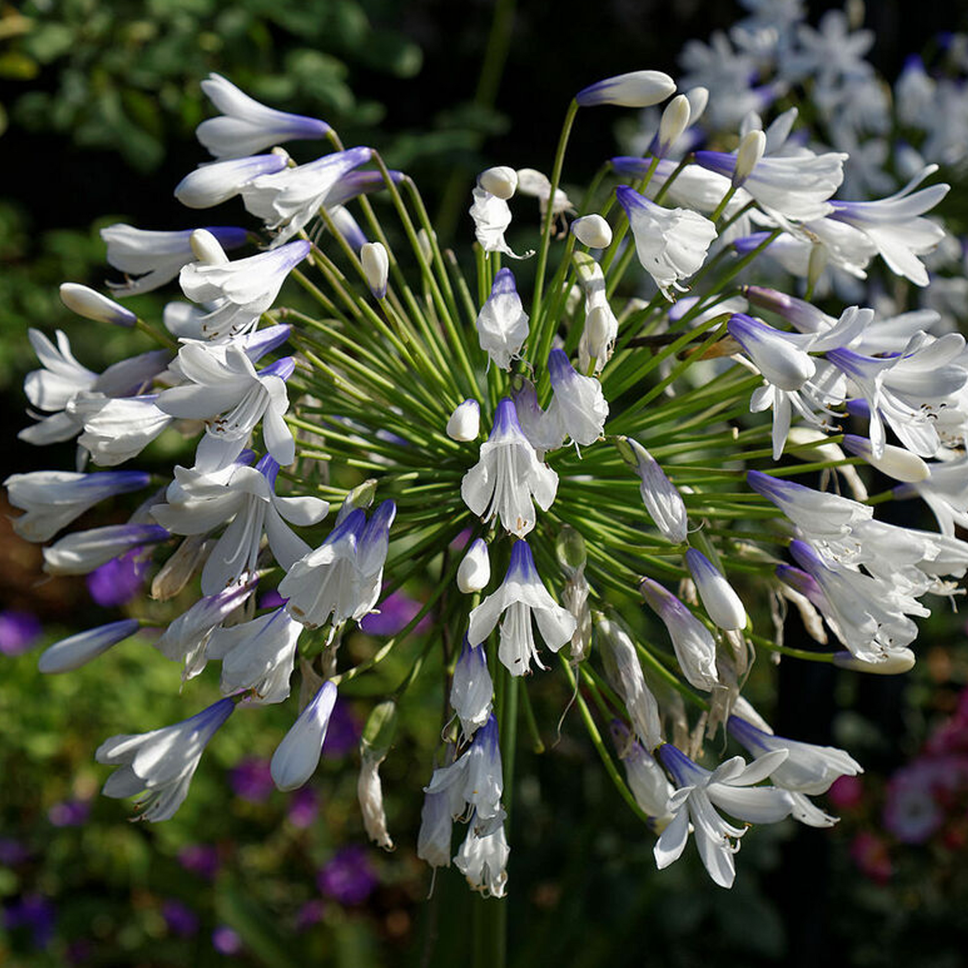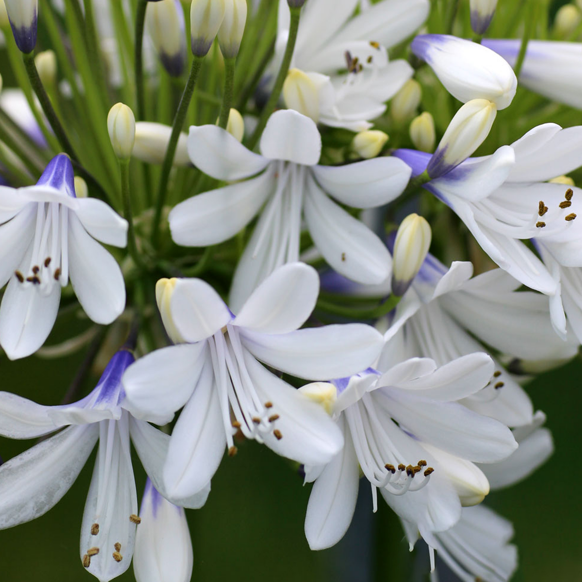 Agapanthus ‘Queen Mum’ is a stunning variety of African Lily and stands out from the rest with its unique dual coloured flowers. A somewhat compact shrub with thick, green strap-like leaves and tall stems that tower above the foliage bearing rounded clusters of small green-white buds that bloom into funnel-shaped white flowers with a violet-blue flush at the base of each one. This Agapanthus is well suited for coastal areas and will tolerate salty sea air.
