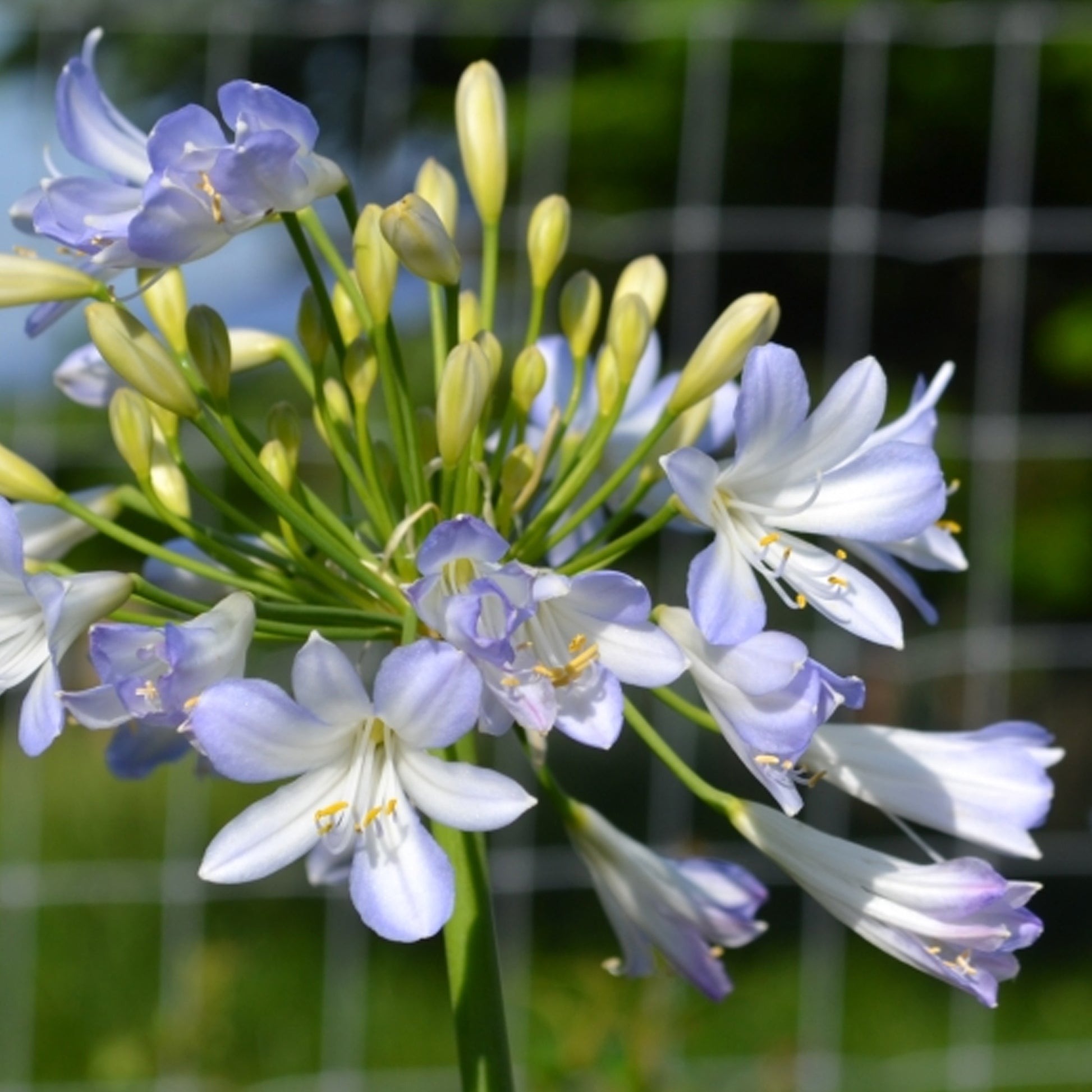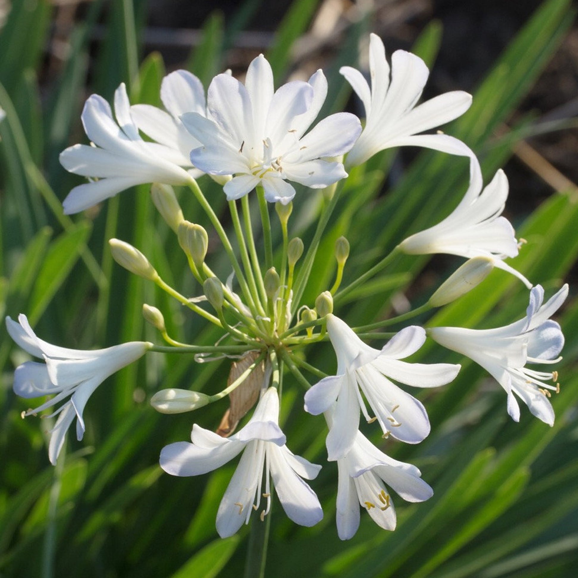 A more compact variety with striking and highly distinctive flowers. The Agapanthus ‘Silver Baby’, or African Lily, is a small evergreen perennial plant with clump-forming foliage of strap-like, dark green leaves which grow beneath upright stems bearing rounded umbels of trumpet-shaped white blooms from mid-Summer through to the beginnings of Autumn. The petals flush with hues of silver-blue along the outer edges to create a very interesting display. A great choice for patio pot planting.