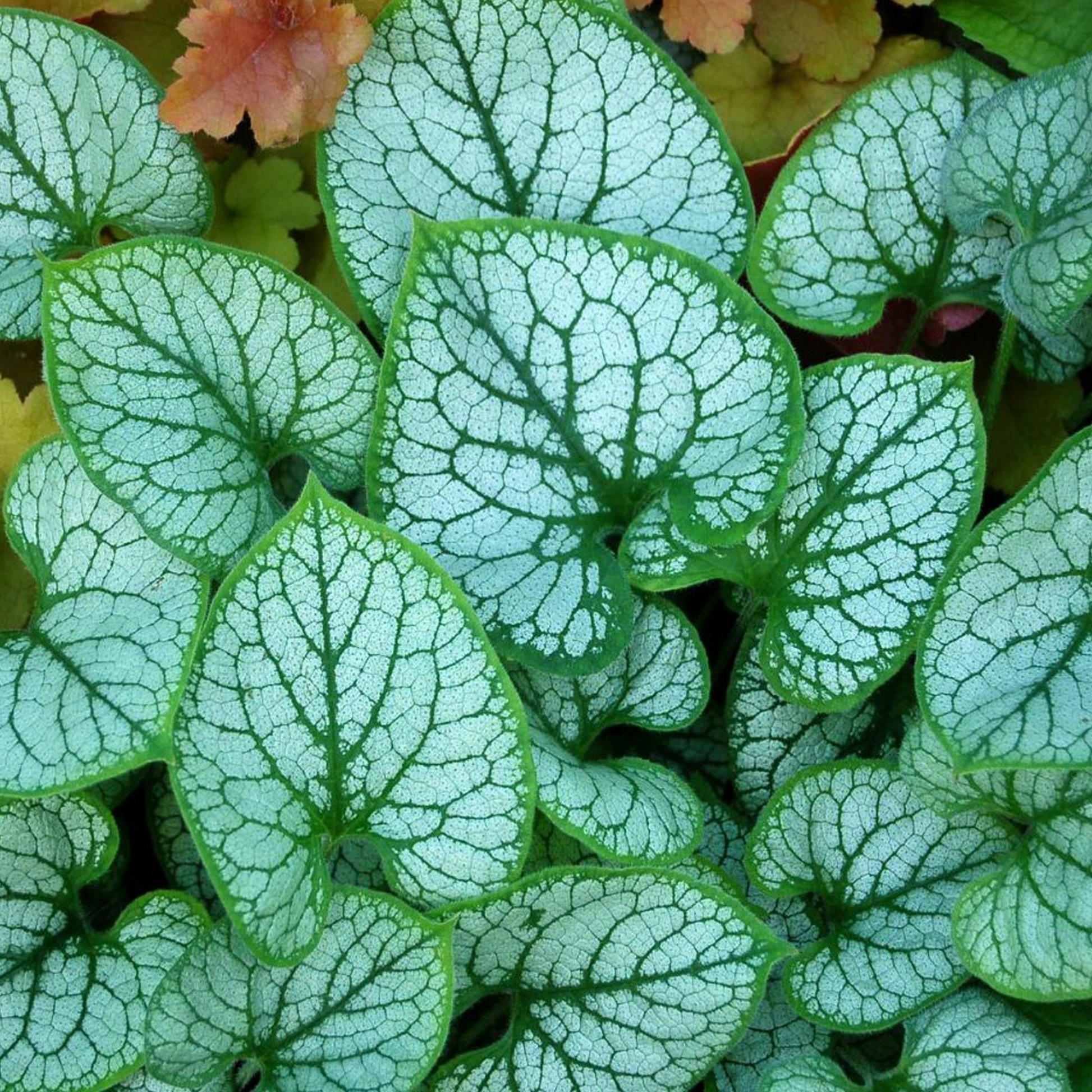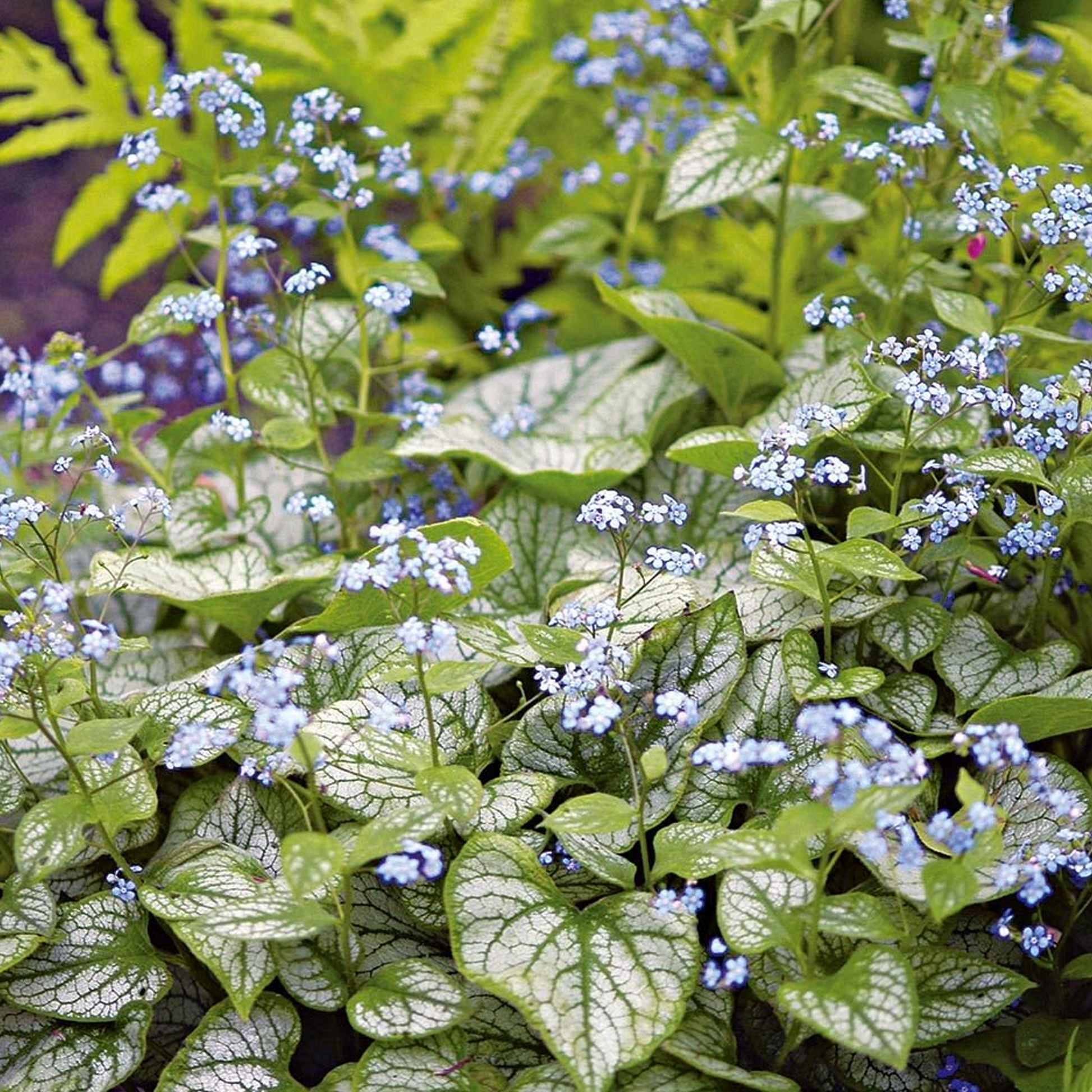 Brunnera ‘Jack Frost’ is a perennial shrub. This variety features silver heart-shaped foliage with dark green veins. Bright blue flowers emerge in the Spring which contrast beautifully against the foliage. This variety is very hardy and will thrive in most soil types. This particular plant will be best planted in a partially shaded area.