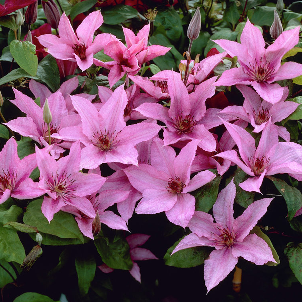 Clematis ‘Hagley Hybrid’ is a tough and hardy shrub with dark green foliage and an abundance of large pink flowers with red anthers. This late blooming clematis is a great option for Summer garden displays, with its large, showy flowers and compact growth it can fit anywhere in the garden with ease, working well when trained on fences or trellis supports. It is also well suited to small gardens or in pots and containers due to its compact nature.