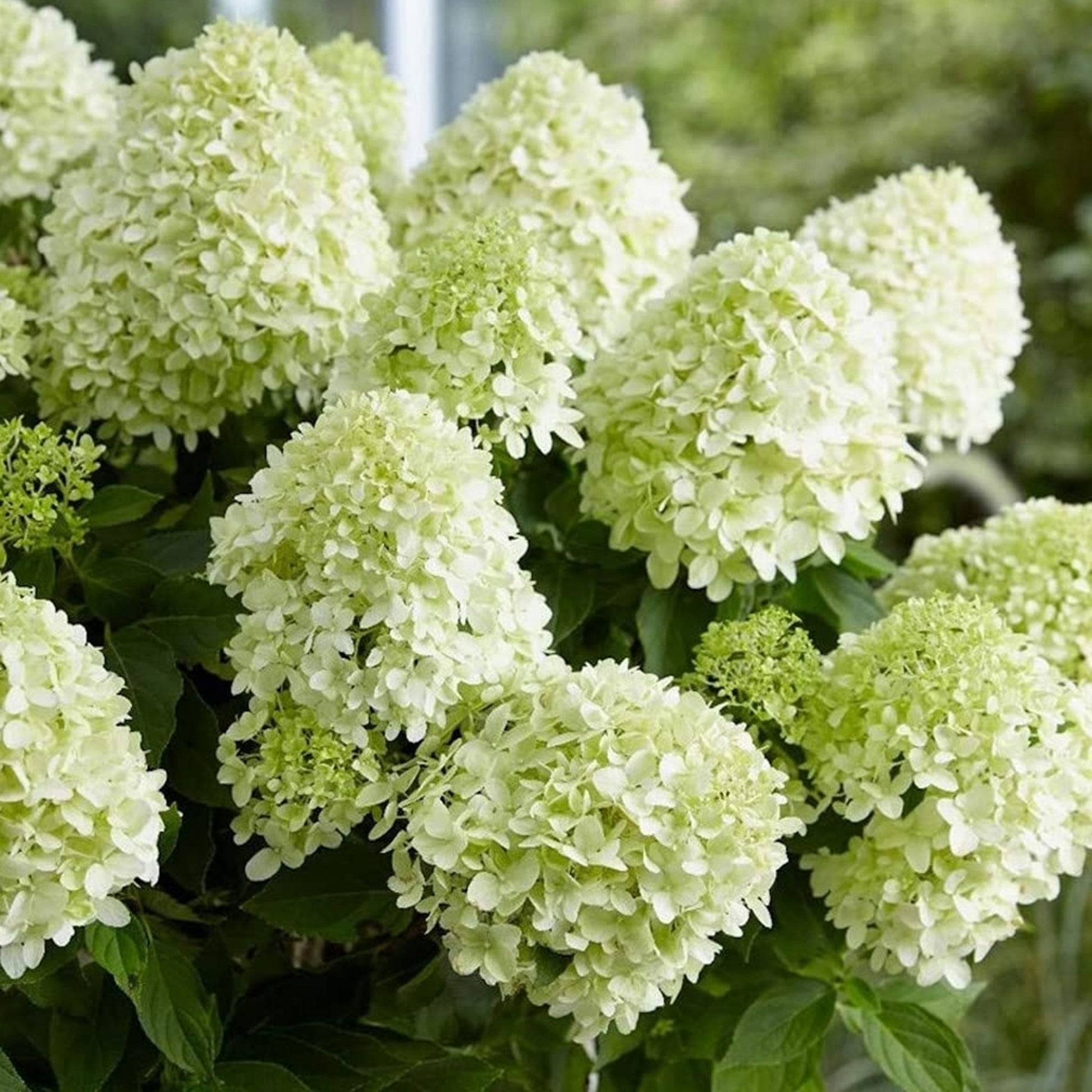 Hydrangea Paniculata Little Spooky is a dwarf hydrangea shrub, boasting masses of showy flowers from midsummer until autumn. Deep green foliage is smothered with dome-shaped clusters of white flowers tinged with green from July until October, almost covering the leaves completely.