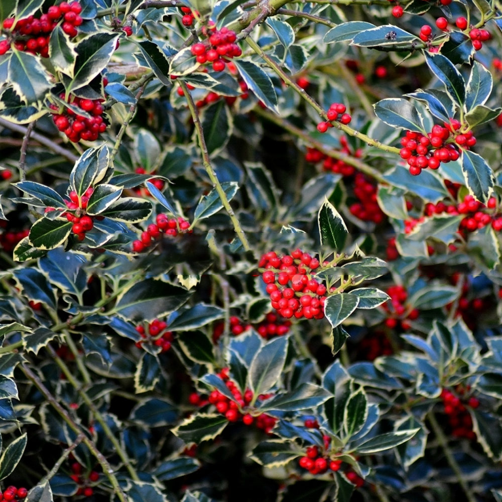 The Silver-Margined Holly produces masses of red berries in Autumn to Winter although inedible for humans, they are both attractive to look at and a crucial food source for animals and birds throughout the Winter months.