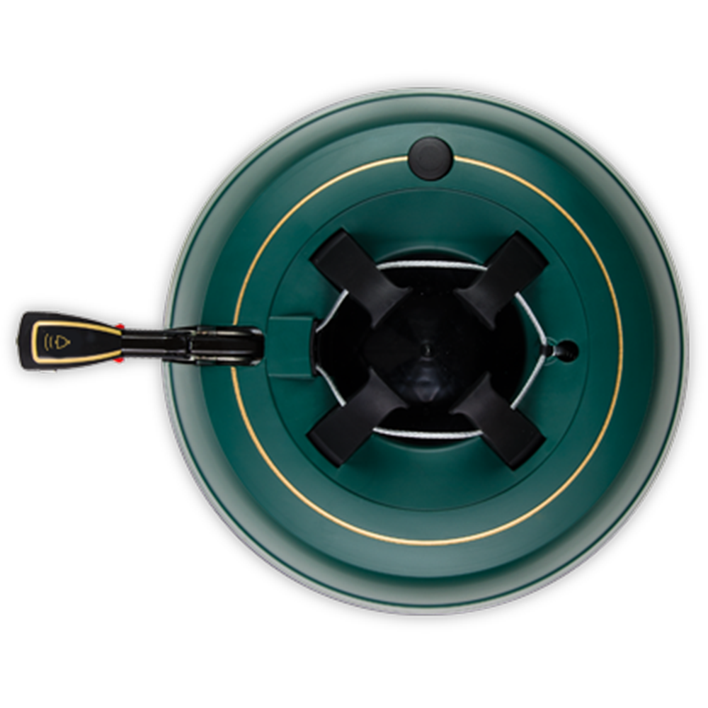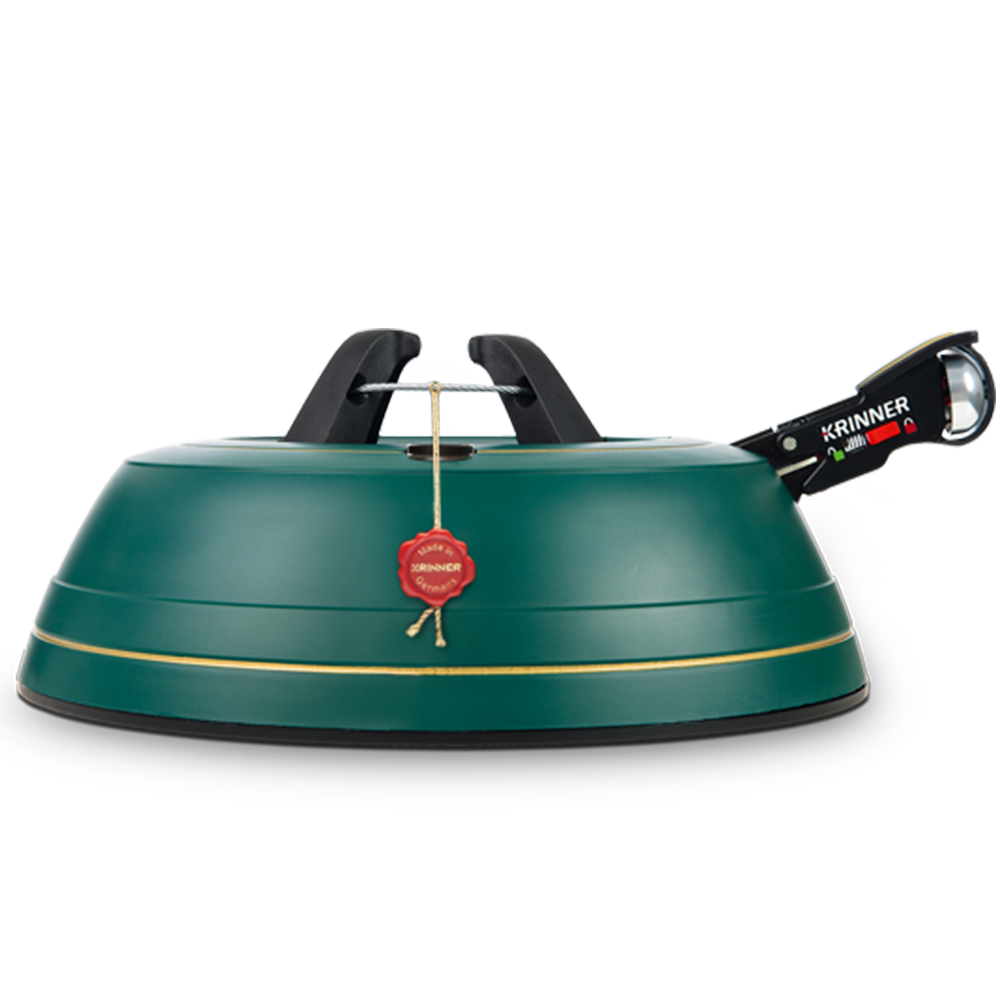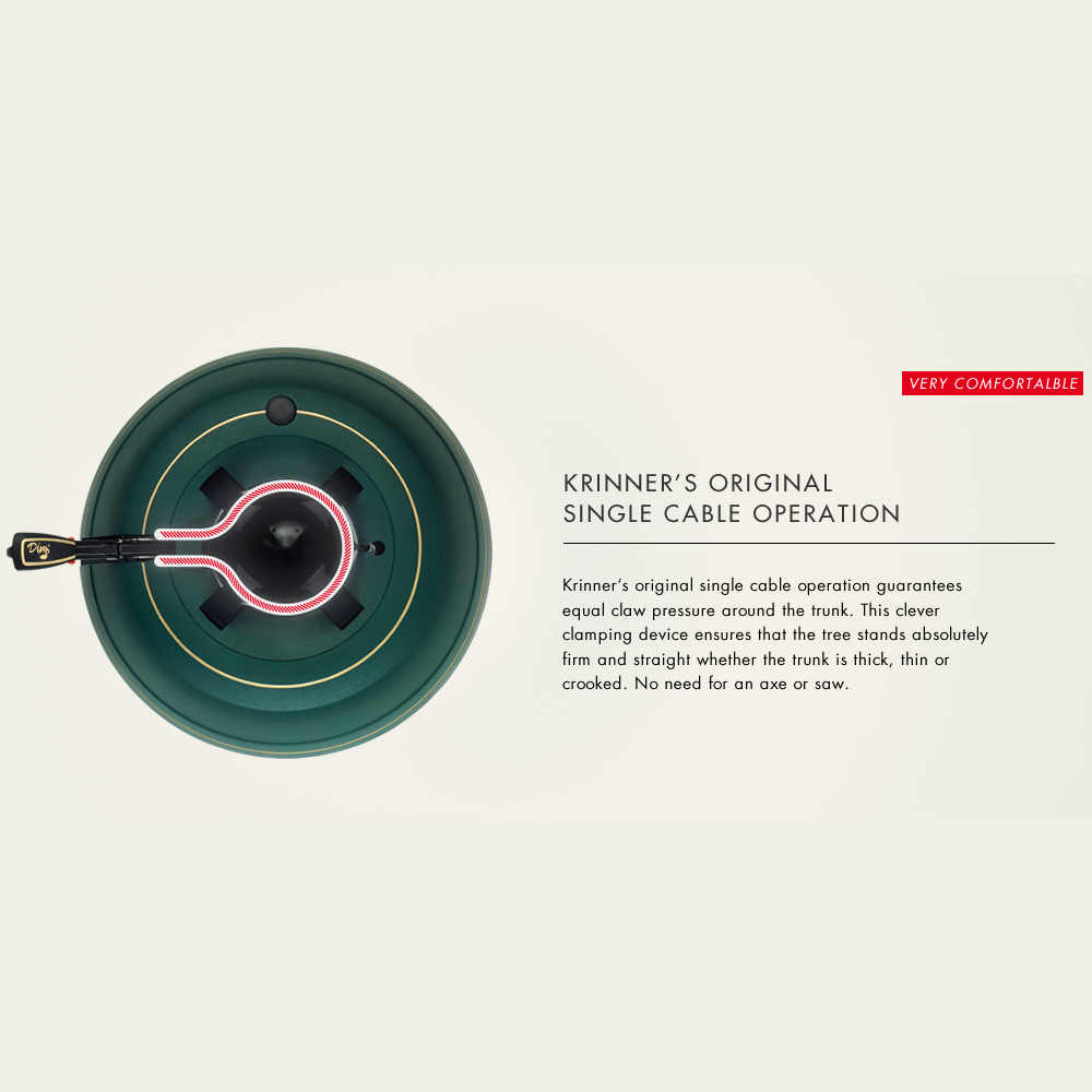 The Krinner Premium L is equipped with the original single cable operation. This clever clamping device guarantees equal claw pressure around the trunk. Just place your tree in the open stand and pump the foot pedal until the claws have firm contact to the trunk, ready! The tree stands absolutely firm and straight whether the trunk is thick, thin or crooked. The revolutionary patented bell in the foot pedal “DINGS” when the claws have securely closed around the trunk. At the same time the foot pedal is automatically secured in the locked position. For a grinch proof Christmas tree. Stressful bending to check whether the tree is straight or to secure the foot pedal is thus a thing of the past. The patented safety belt with its step by step ratchet mechanism provides additional safety so that the tree cannot fall over spontaneously.