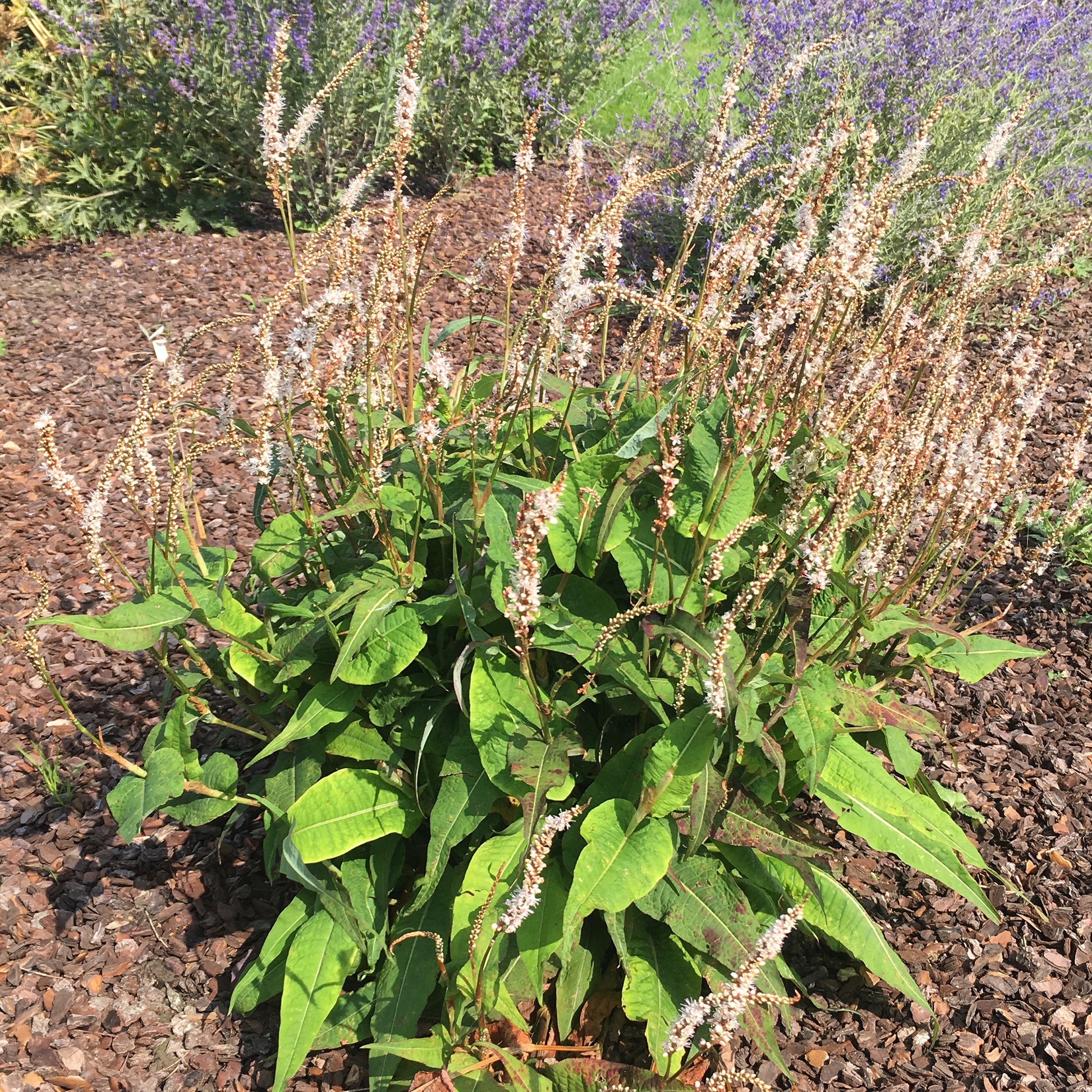 Persicaria Alba Junior is an upright perennial with a clump-forming habit. Its thick mound of large, pointed, oval-shaped, mid green leaves is accompanied by tall spires of tiny white flowers. These flowers, sometimes tinged with the slightest hint of blush pink, bloom from late summer until late autumn.