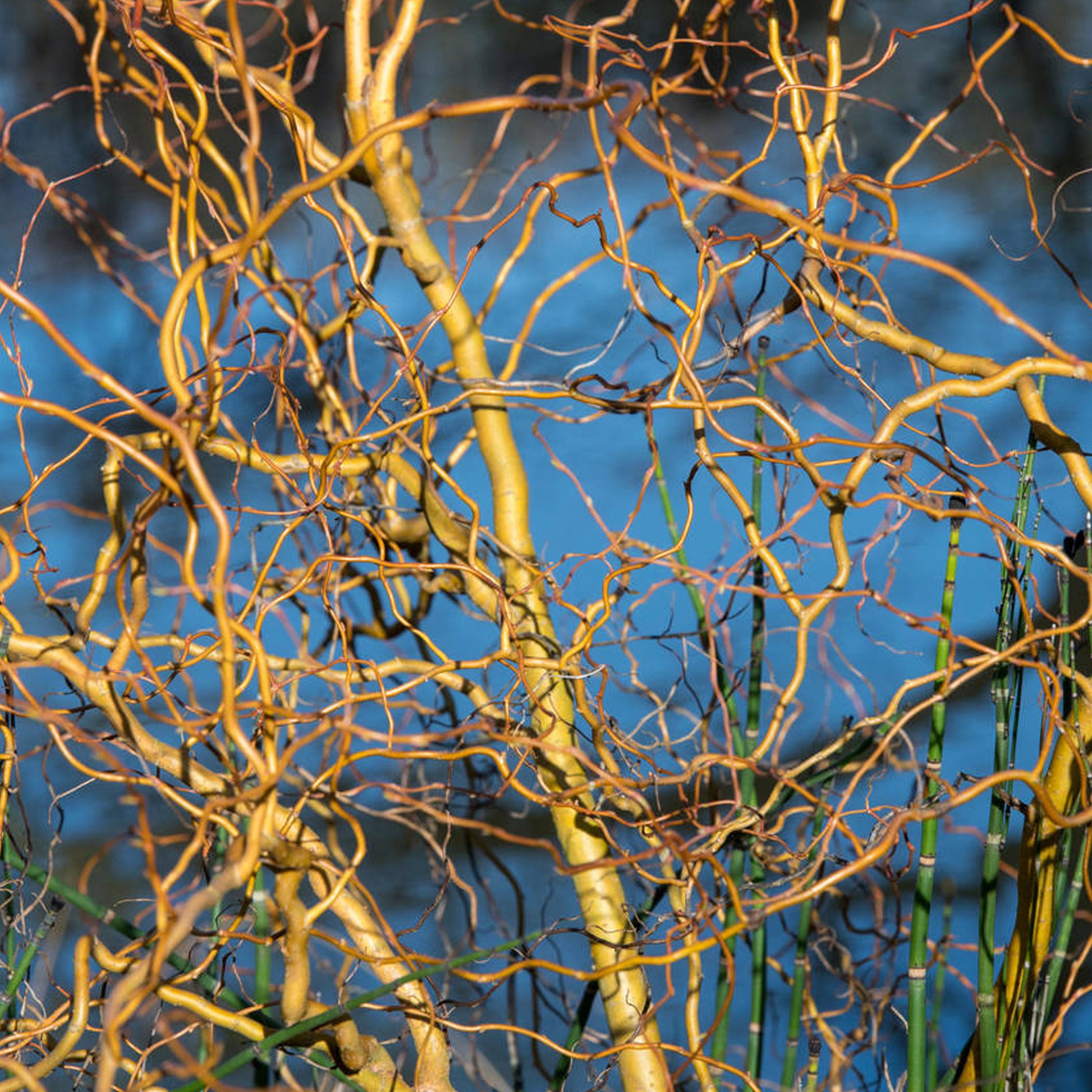 Salix Erythroflexuosa is deciduous tree, producing bushy foliage made up of narrow, bright-green, lance shaped leaves and bright yellow catkins in Spring. The trees branches are a standout feature - they are smooth and twisted, starting out as a vibrant red colour before maturing to a golden brown.