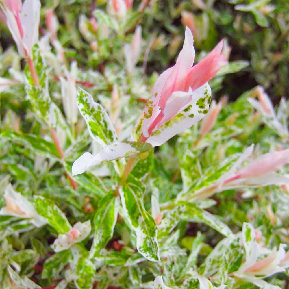 Salix integra ‘Hakuro-nishiki’ more commonly known as the Flamingo Dwarf Willow is a deciduous tree that is covered in pink tipped leaves in Spring and Summer against a backdrop of green and white varicoloured foliage. The Flamingo Willow also sports yellow catkins during the late Winter months, these appear on the orange/brown branches.