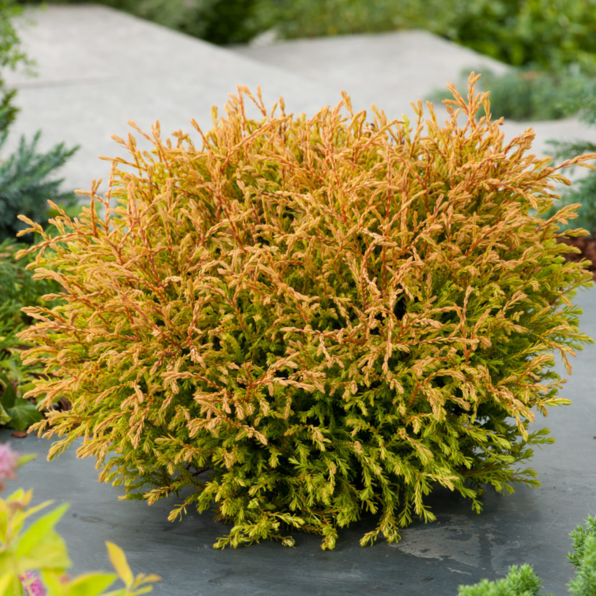 Thuja ‘Golden Tuffet’ sometimes known as White Cedar is a dwarf variety of the popular evergreen conifer which provides year-round colour and vibrance. The green-gold foliage gains a tinge of orange as it matures towards the Winter. A great option of compact plant for use as part of a small rockery display or bedding. Can be potted, requiring little maintenance due to its slow growth.