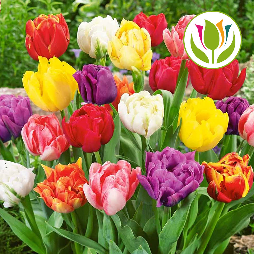 Double Early Mixed Tulips provide a wonderful display of colour. The flowers are made up of dozens of petals arranged in a whorl around the centre. If the bulbs are not spaced too far apart, the opened flowers will touch and will form the most spectacular display, a perfect carpet of spring flowers.