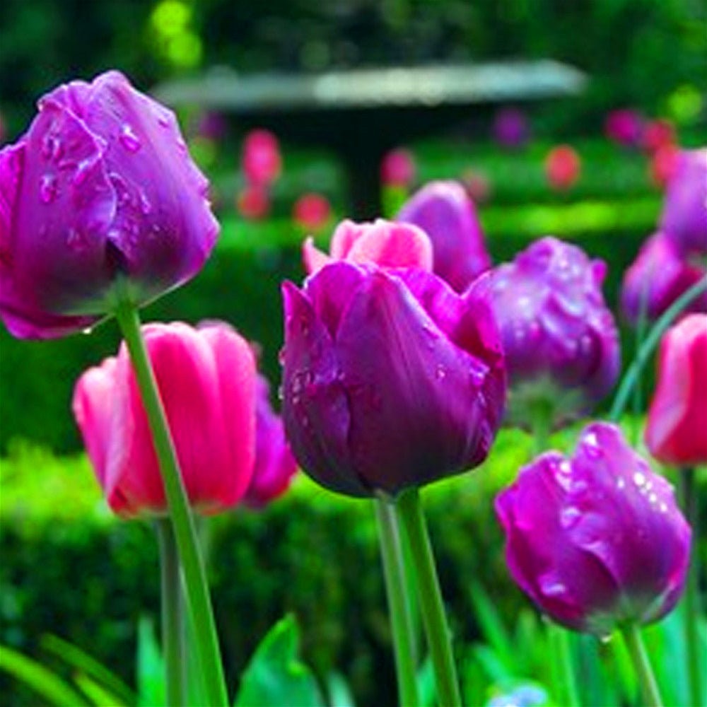 Perfectly simple blooms in array of purple hues. For a spicy summer display plant en-masse with bright orange and red varieties such as El Nino, Red Flag and Sun Catcher. Triumphs are a cross between Single Early Tulips and later flowering varieties so have the strong weather hardy stems long flowering lives associated with these varieties with the added bonus of the beautiful and distinctive traditional tulip shape. Flowers April into early May. 11-12cm bulbs supplied.