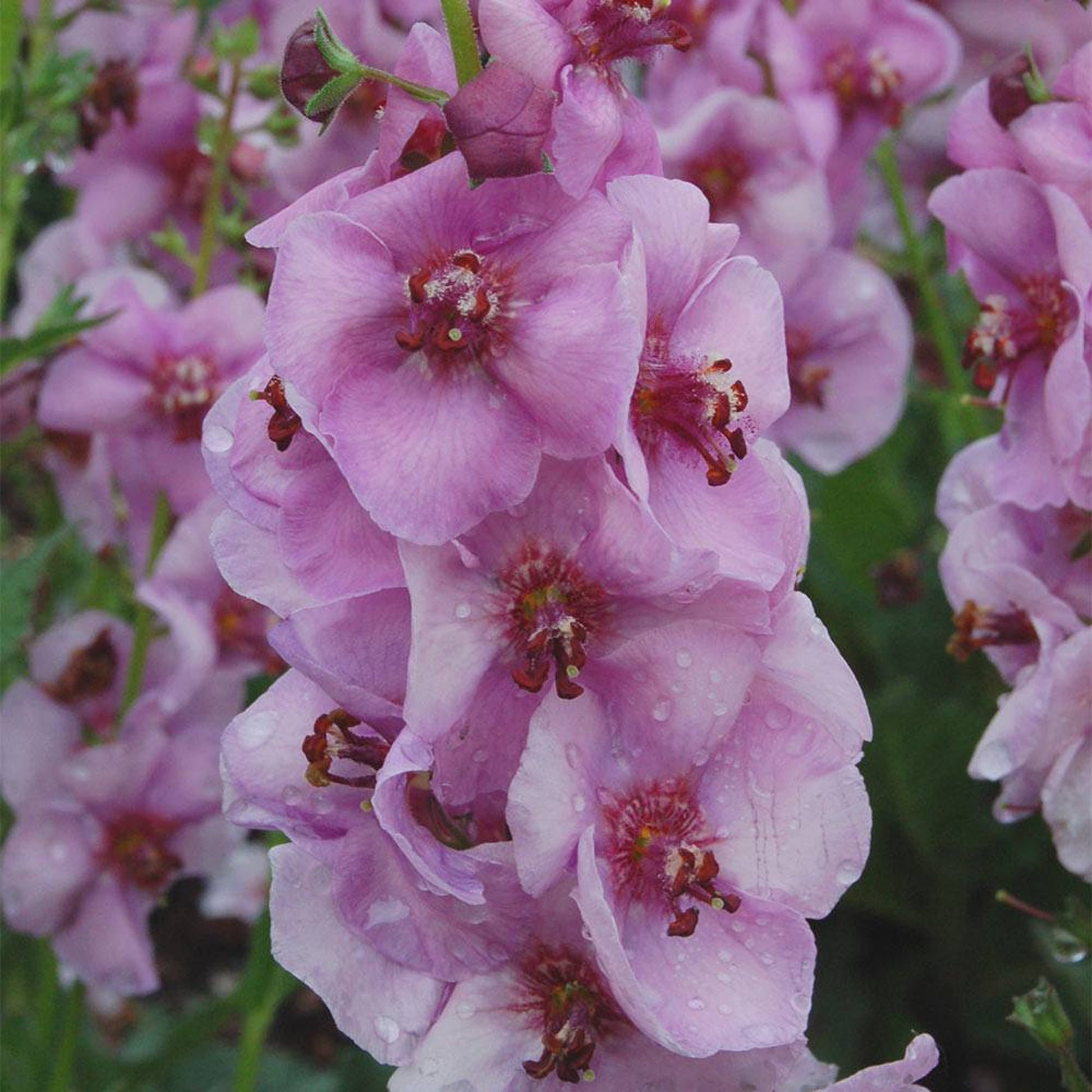Verbascum Lavender Lass, commonly known as Mullein, is a semi-evergreen perennial that is ideal for ground cover and filling gaps. Large textured dark green leaves grow into rosettes and tall stems spring from its centre, blooming striking pink purple flowers throughout summer.