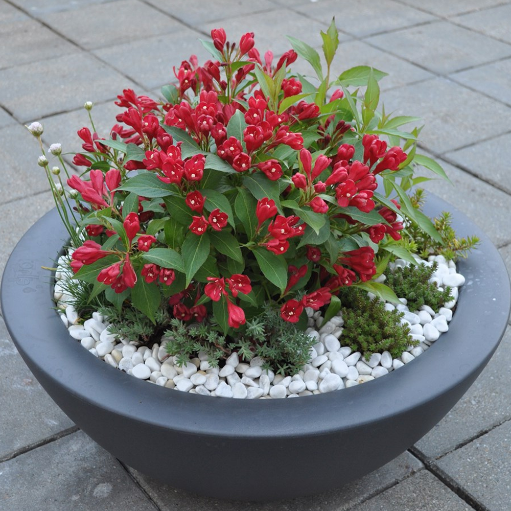 Weigela All Summer Red or Slingco 1 is a prolific flowering plant that will keep your garden looking perky throughout the summer. It is a medium-sized deciduous shrub that features green foliage and beautiful crimson-red flowers. Its compact size allows it to fit garden containers although it looks brilliant when it is planted in shrub borders. This dwarf Weigela is a reliable performer and a tough plant that will produce flowers for a long period of time.