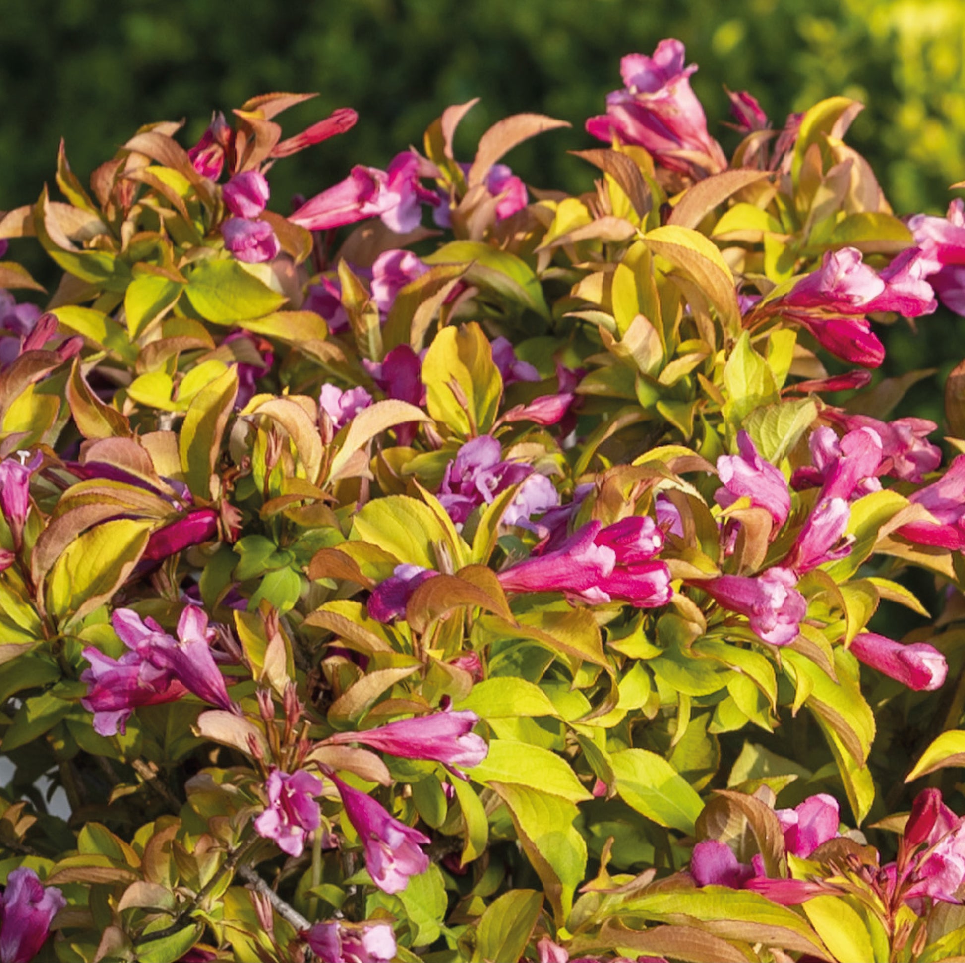 Weigela Magic Carpet is a deciduous shrub that maintains a compact nature, whilst showing off a vibrant array of colour. The growing season - Spring into Summer - is where the magic happens, with bright green new foliage surrounding an abundance of bell-shaped pink flowers. As the plant ages, the leaves will take on a shade of apricot-orange, adding a new colour wave, and therefore, a further period of interest. The size of this variety makes it ideal for planting in a pot, container, or amongst a border, patio or balcony display.