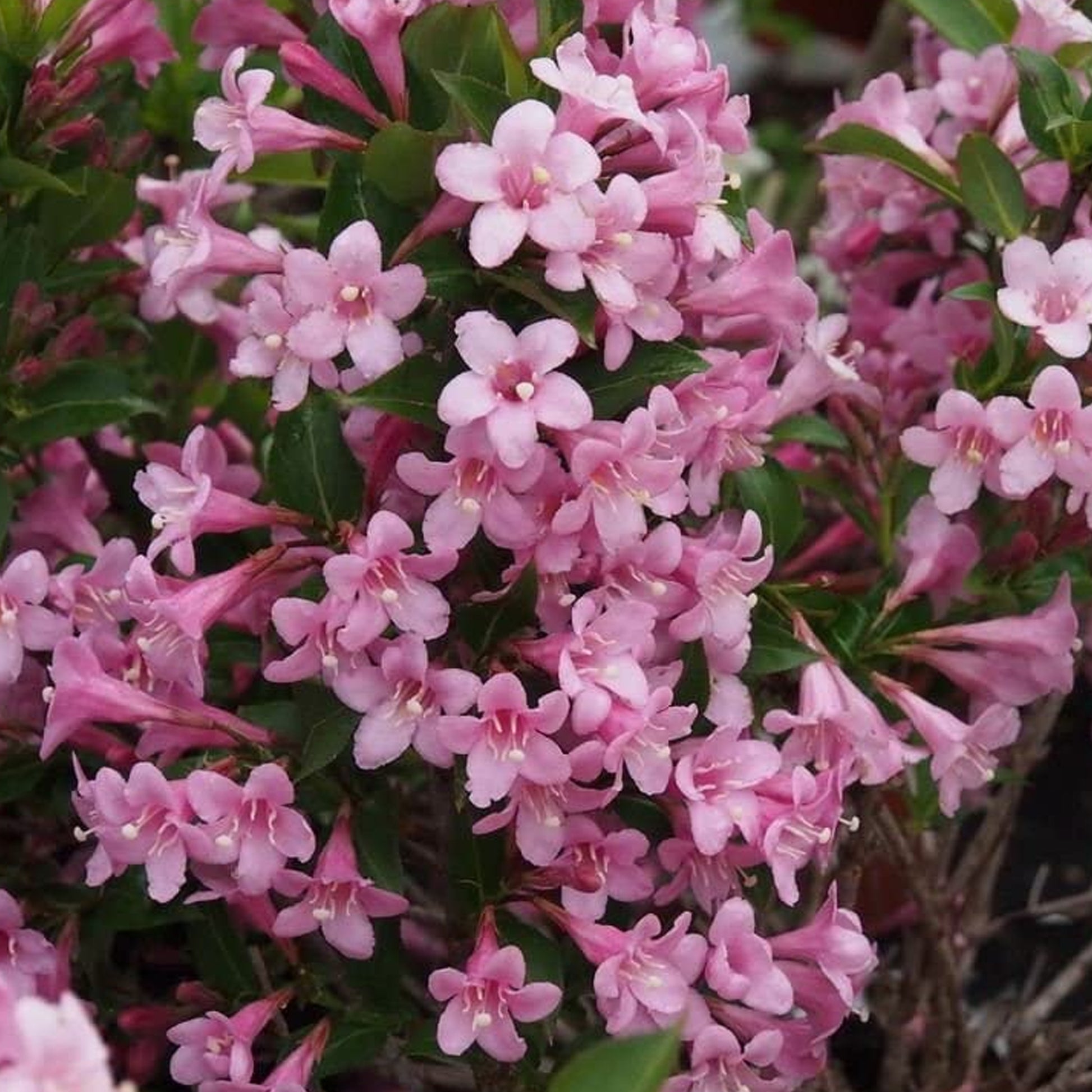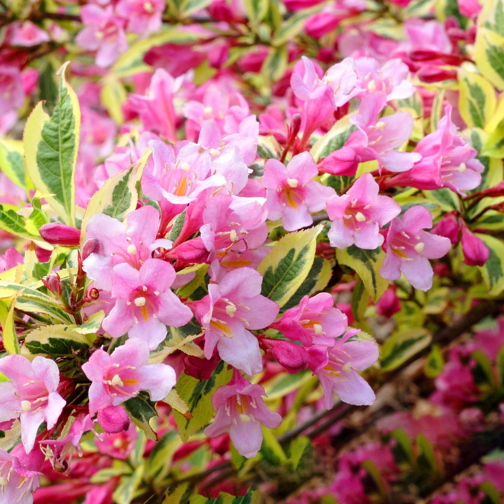 A bushy, deciduous shrub with bursts of colour throughout the seasons. The Weigela ‘Magical Rainbow’ is a more compact plant with widely ovate green leaves with cream-yellow margins from Spring which gain touches of pink as it progresses into Summer. Clusters of dark pink buds appear all through the foliage and bloom into trumpet-shaped light pink flowers from late Spring through to Summer. A great option for patio pots or garden borders.