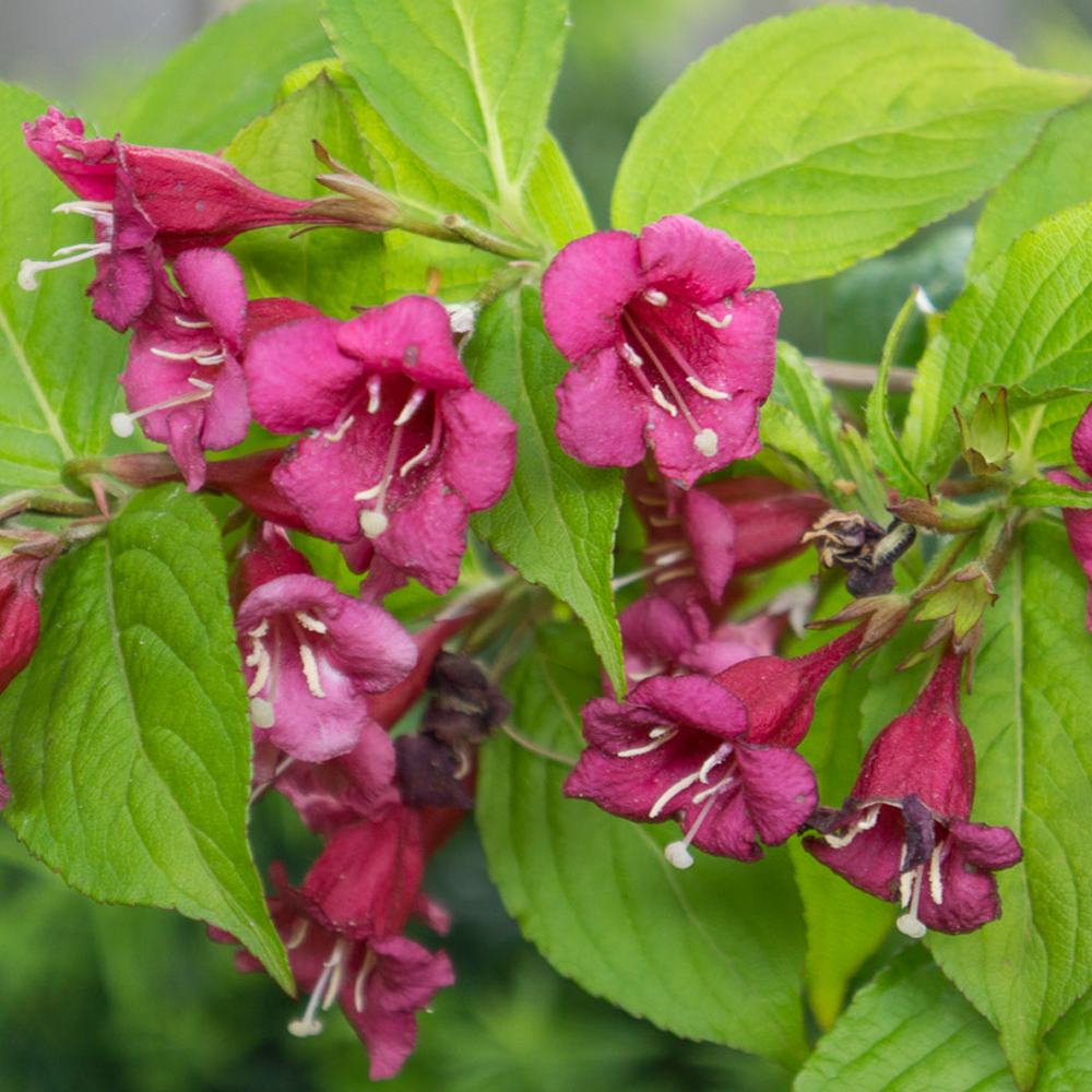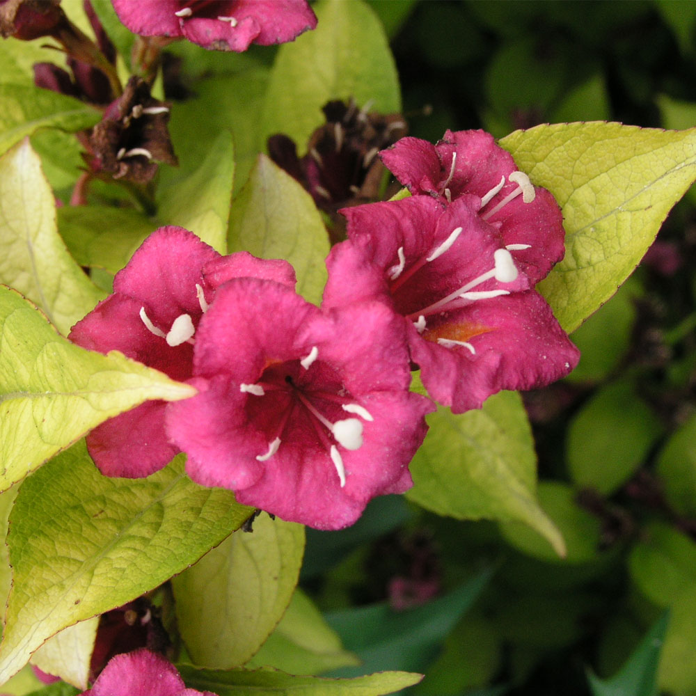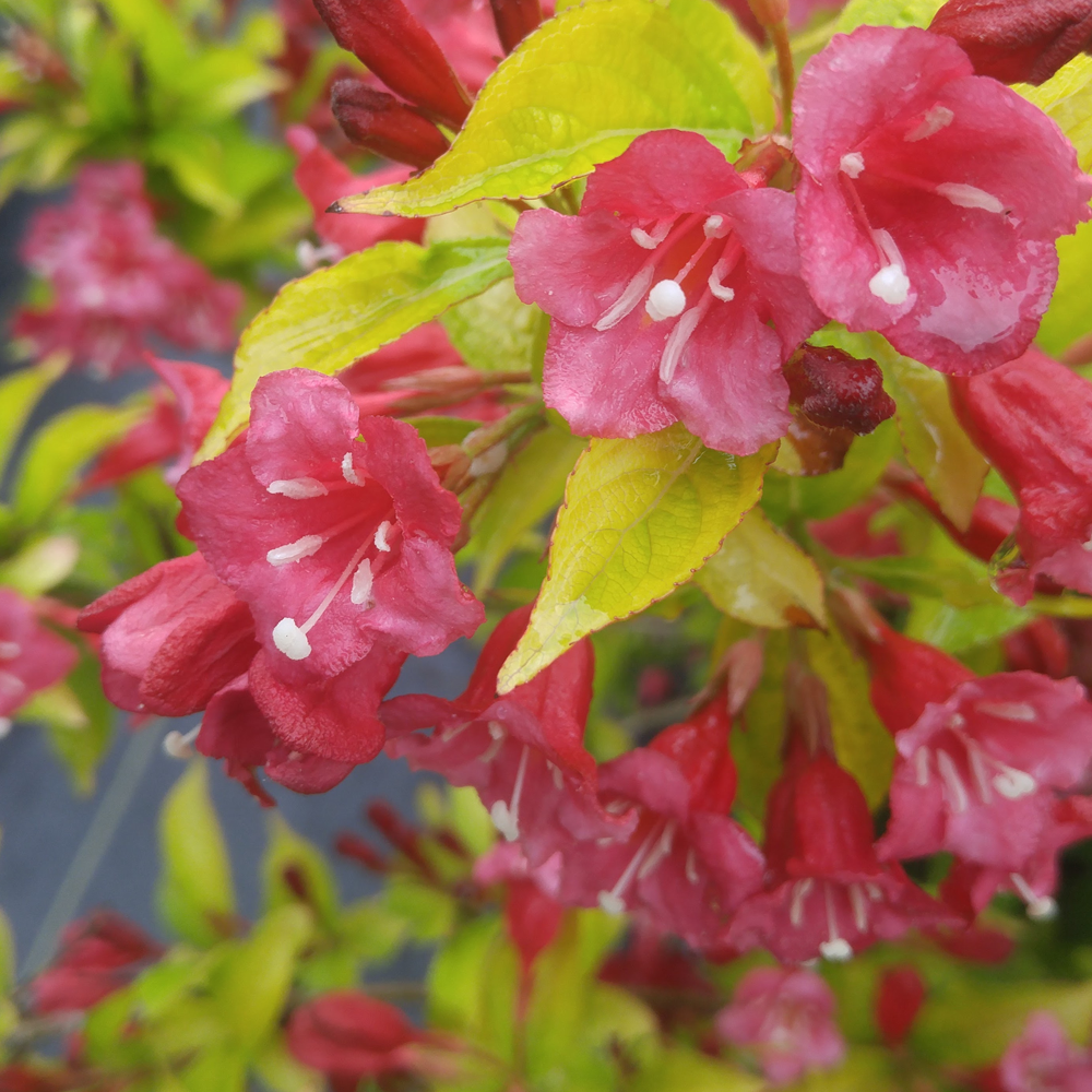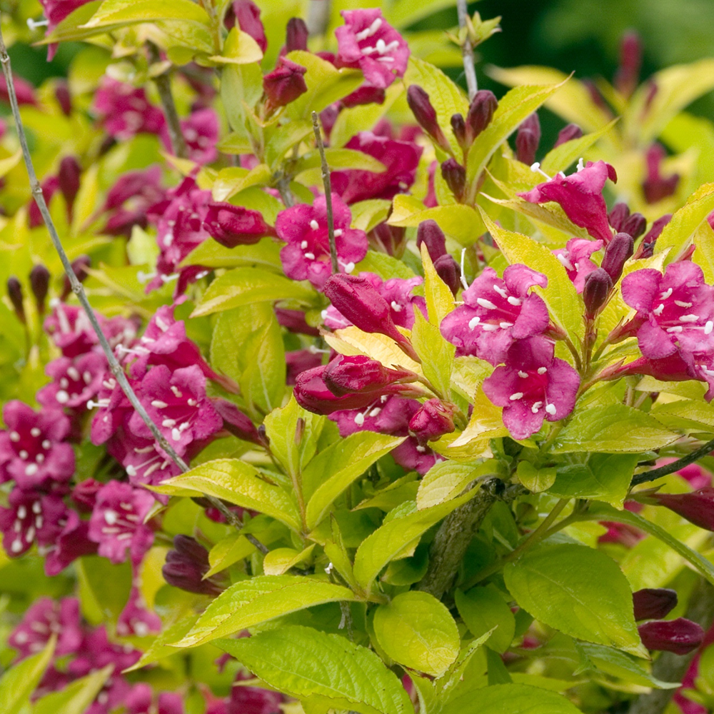 Weigela 'Rubidor' is a deciduous easy to grow shrub. The foliage of this shrub boasts a beautiful green/gold mix of leaves throughout spring and summer, these leaves are accompanied by bunches of trumpet-like reddish/pink flowers that are highly attractive to pollinators such as bees. This variety is extremely hardy, it can survive harsh climates and can thrive in almost any type of soil so long as it is well-drained. These plants prefer a fully sunny position but can tolerate partially shaded areas.