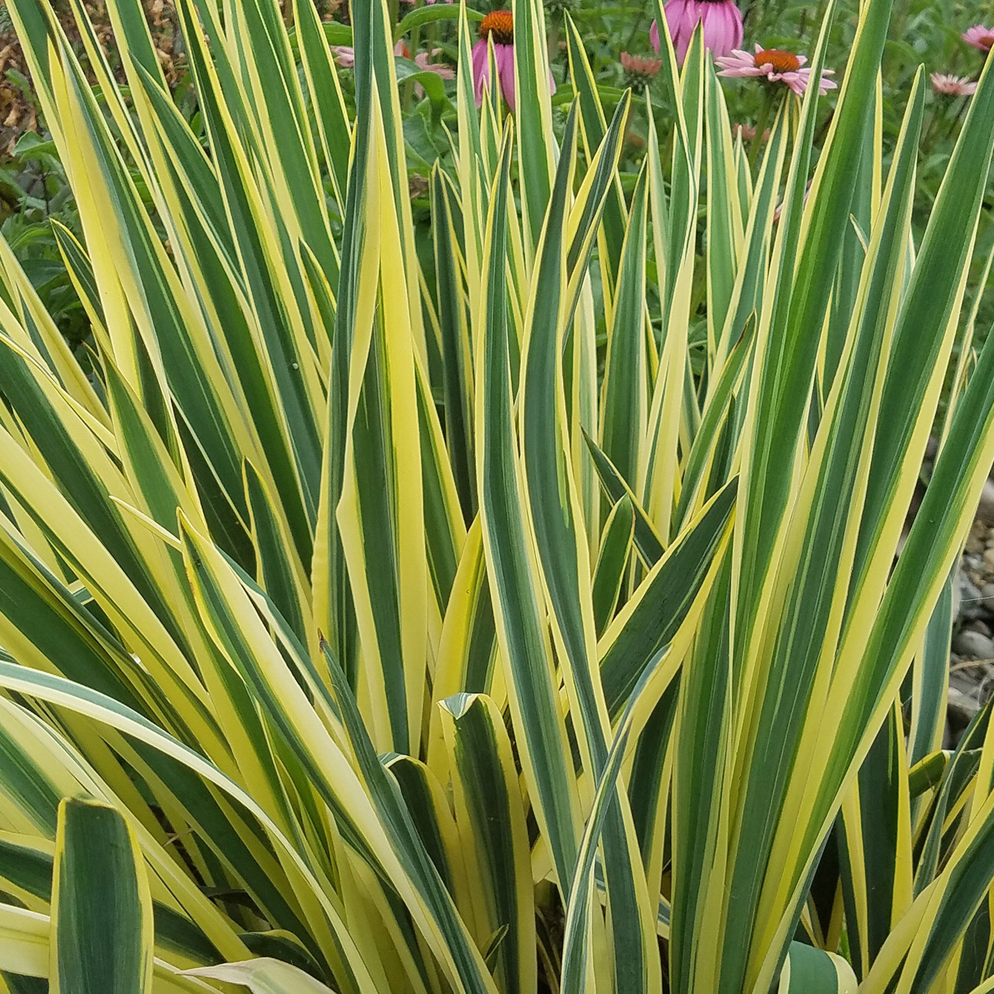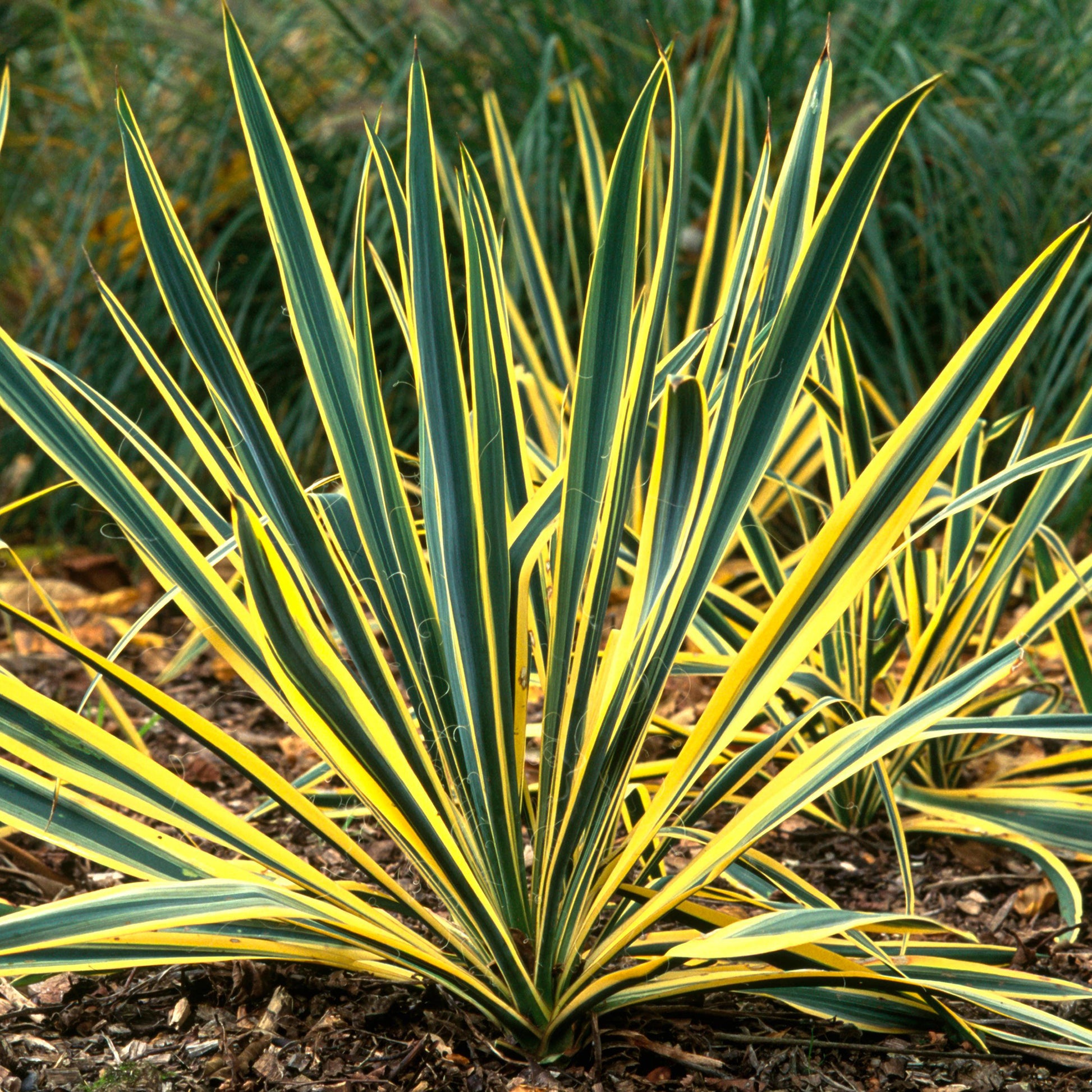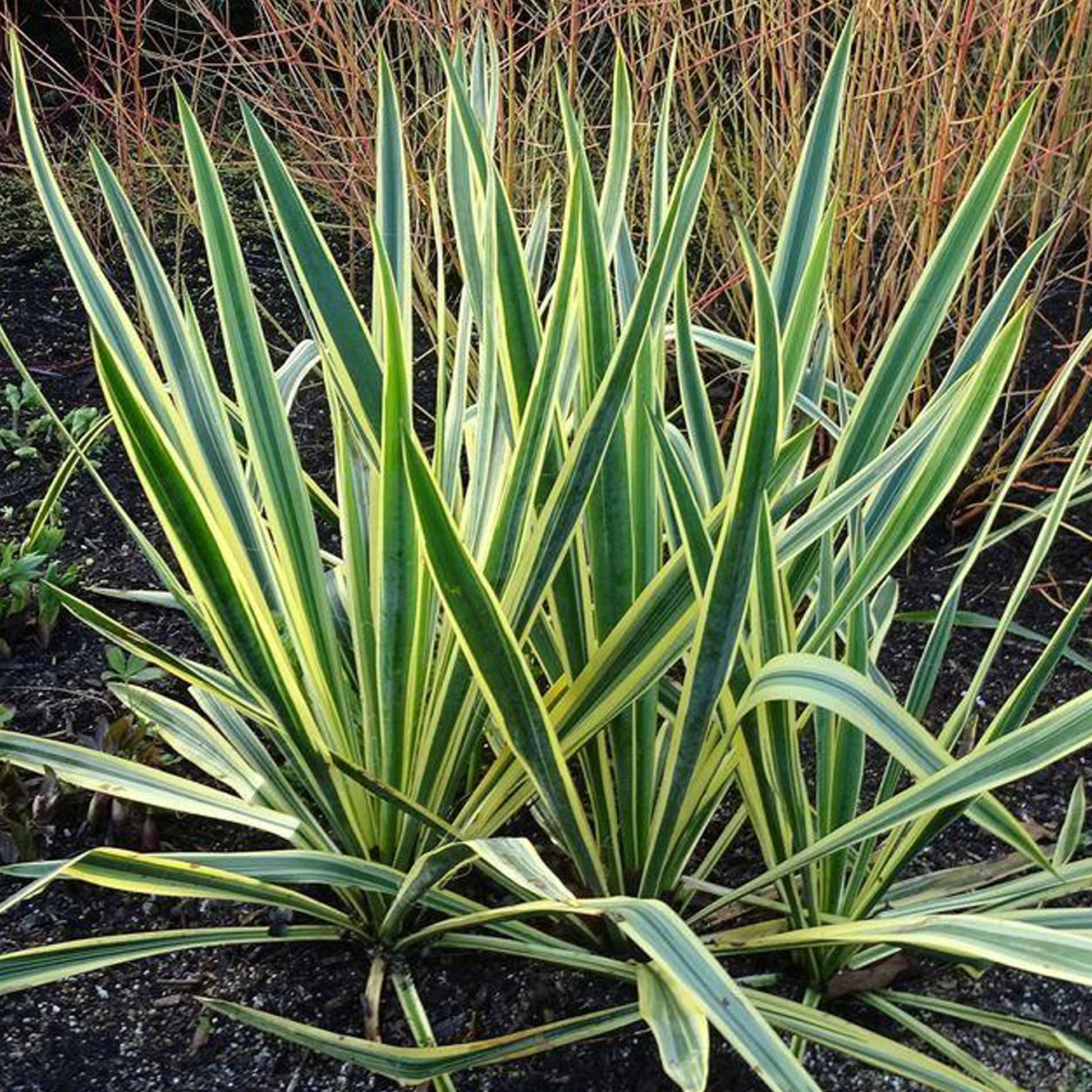 A lovely little shrub with broad, leathery leaves of dark green edged with yellow, the Yucca 'Bright Edge', sometimes called the Needle Palm or Adam's Needle, brings bright contrasting colour to garden beds and arrangements. The foliage growing in clump-forming, arching shapes beneath tall, slender stems which appear in the Summer which usually carry panicles of small cream-white nodding flowers from late Summer.