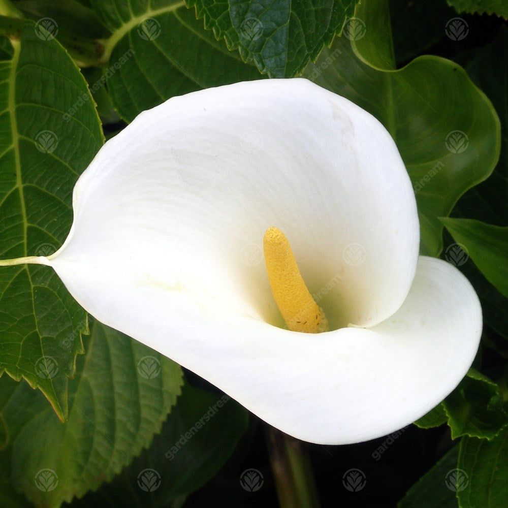 Zantedeschia Aethiopica is ornamental flowering plant with unique flowerheads and large, dark green foliage that is heart-shaped. Blooms are large and composed of a large creamy white bract which encompasses a golden yellow flower spike called a spadix.
